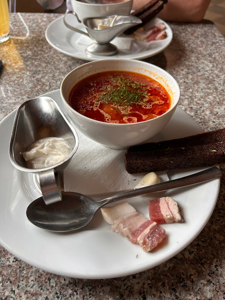 Отлично всё. Женщина , которая нас обслуживала вообще супер. Жаль не сфотографировала подачу блюд..это вообще космос.кроме супов, там реально всё готовится для вас свежее, а не накладывается готовое👍 Нас было 2 взрослых и 3 детей. Заказывали борщ, окрошку, картошку по деревенски с мясом 😋😋😋все остались довольны. Такой вкусной еды мы ещё не ели нигде.однозначно советую 👍👍👍