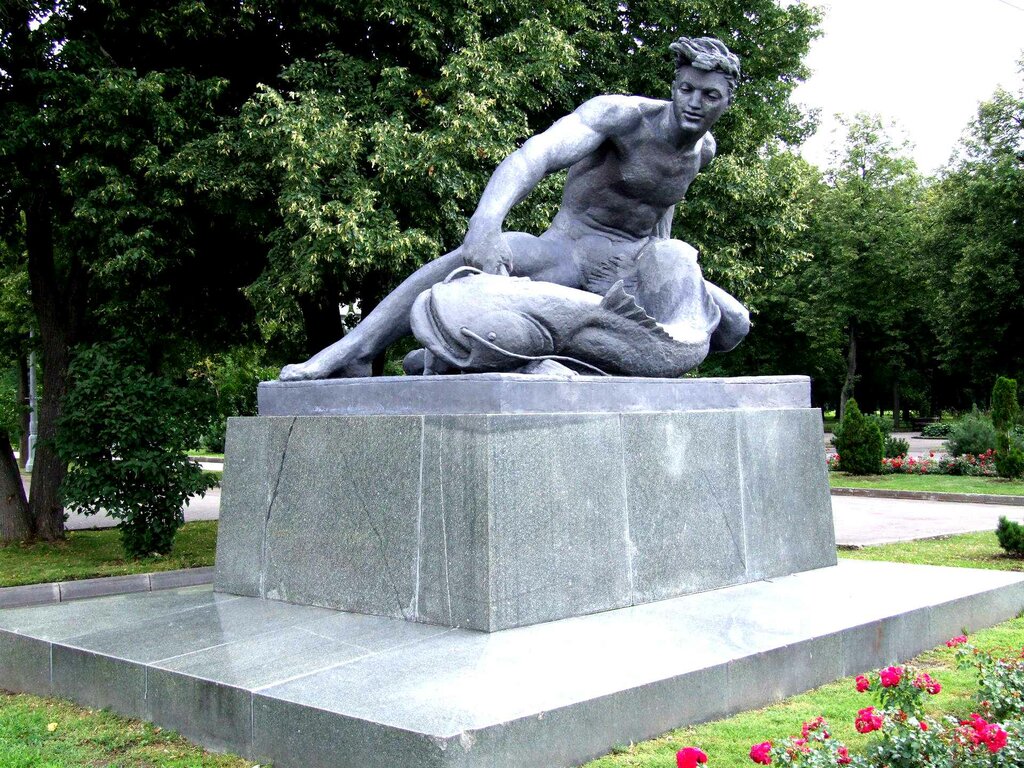 Аллегорическая скульптура "Вода"- напоминает, что любая стихия подвластна человеку всегда! Её создали ученики Веры Мухиной – скульпторы Нина Зеленская и Зинаида Иванова совместно с архитектором Игорем Рожиным в 1957 году.Юбилей у скульптур,- 65 лет, надо будет иметь в виду) Объекты появились на территории спортивного комплекса в середине 1960-х годов.Любой рыбак оказаться на месте юноши готов,/воскликнет, - батюшки, эх, ма- вот бы мне поймать такого сома)/Юноша- собирательный образ ,это и человек - амфибия, и 15 летний капитан, и моряк, которому во что бы -то не стало надо выполнить, по ловле рыбы ,план)Под правой ногой у юноши краб, да,- видно по всему ,- ловец сома - природы не раб)Красивый и ловкий мужчина, такому волноваться о будущем нет причины)Вместе с девушкой , расположенной по соседству, как будто нам подсказывают ,что есть способ, как выжить во время кризиса , по- моему для молодой семьи реальное средство.Не просто рыбку поймать золотую, но стоит попробовать поймать, хоть такую), вспомнились для примера стихи Б.Заходера:" Трудно маленьким сомишкам, надо жить своим умишком, не пожалуешься маме, сам справляйся, сам с усами")Всем сил и проблем решения, фото скульптуры- вам для вдохновения)