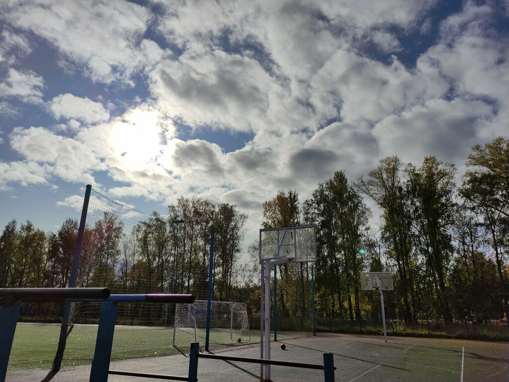 Брусья ровные, в меру высокие, на Баскетбольном поле есть мяч, можно поиграть)