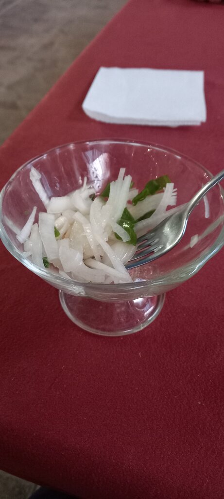 10 января пришли в 12.30 на обед. В ресторане ни души. Официант ползает еле еле. Сделали заказ один суп, два горячего и два салата. При оформлении заказа выяснилось что выбора блюд нет. Только Овощной салат, греча и гуляш. Официант не прочитал нам наш заказ, чтобы проверить и ушёл. В итоге на двоих принёс один суп, один салат и одно горячее. Минут 5 ждали, в итоге на вопрос где второй комплект, сказал что мы заказали все по 1 шт и со словами "сейчас принесу" удалился. Через минуту пришёл и сказал, что ни гречи, ни мяса, ни овощей больше нет. Просто класс! Через 20 минут заканчивается обед, пора на работу, люди голодные... На просьбу позвать администратора или директора, ушёл. Ни слова не сказав, встал за барную стойку. На повторную просьбу позвать вышестоящее руководство сказал, что никого нет и ничего он сделать не может!! Ужасное отношение, ну нет у вас продуктов, повесьте объявление, или скажите что вы не работаете!!!!! Официант единственный и совершенно не умеет грамотно выполнять свою работу!!! Испорченное настроение и голодный желудок.. не советую!!! П.с.на фото Овощной салат. Помидоры и огурцы съели. Осталось два вида лука. Я бы назвала этот салат "Луковый"... 😝