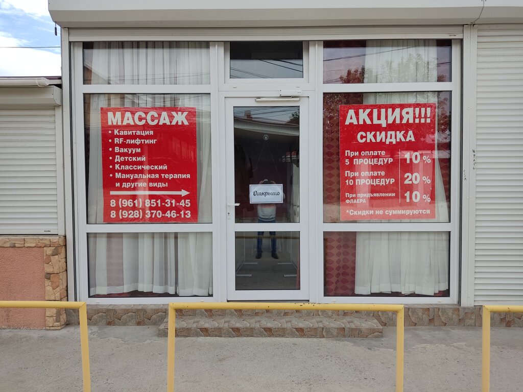 Отличный массажный салон с отличными специалистами,Виктор Викторовичь Чернов и Тахир! Всё делают на 5 баллов! Соотношение цены и качества выше всех похвал,нет ни какого "поглаживания ладошками" для вида,всё разминают как положено и выходишь с ровным новым позвоночником😀! Всем советую кто на отдыхе планирует заняться своим здоровьем хотя бы раз в год👆!!!