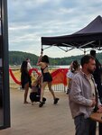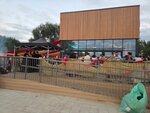 Роскошный ресторан на берегу пруда, спортивная тусовка, приятные молодые люди и девушки. Прокат гидрокостюмов, реверсивная подвесная дорога для катания на вейке.