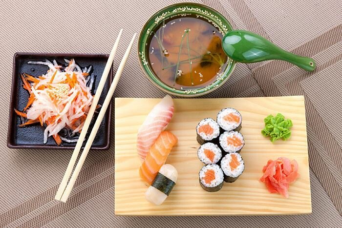 Variety of food:sushi and rolls, pizza, fixed meal, сhinese food