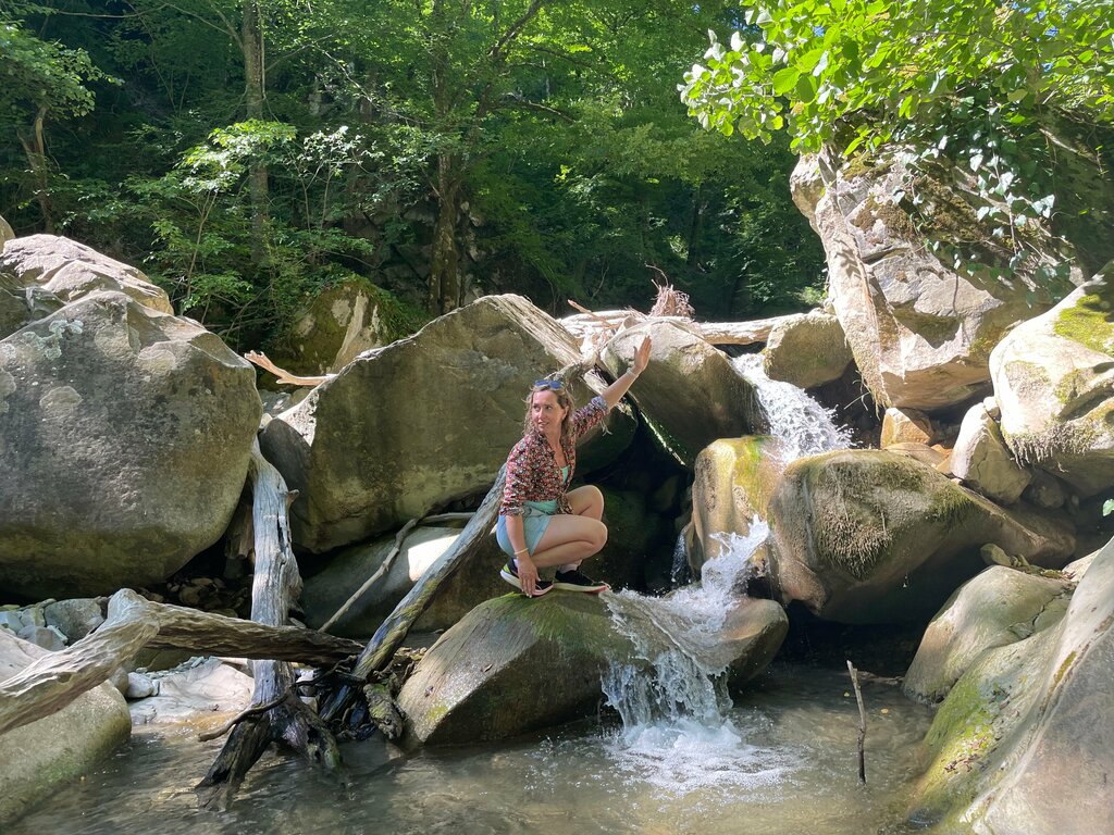 Место живописное, много валунов, водопадики маленькие, забрались по веревке, дальше обычное русло как в поселке, прошли метров 200 и вернулись обратно, есть ли дальше водопад так и не узнали