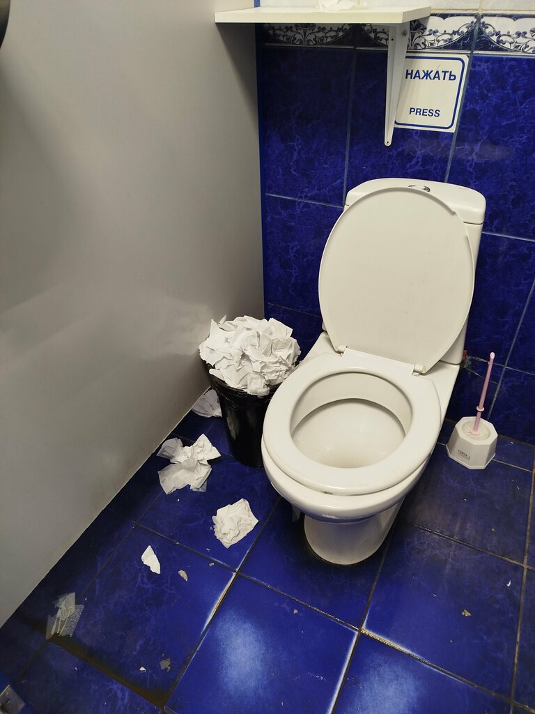 Самый ужасный туалет во всем районе, никто не убирает, вонь стоит, что сбежать хочется, туалетной бумаги нет, зато переполнены корзины мусорные так, что на полу все валяется.