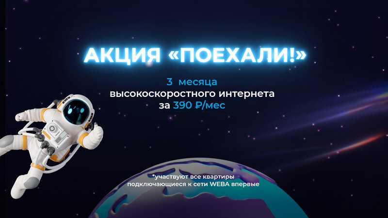 3 месяца высокоскоростного интернета всего за 390 ₽/мес! Участвуют все квартиры, подключающиеся к сети WEBA впервые