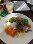 Гонконгская вафля, нежнейший малосоленый лосось, творожный сыр, яйцо пашот, листья салата. Завтрак подается целый день