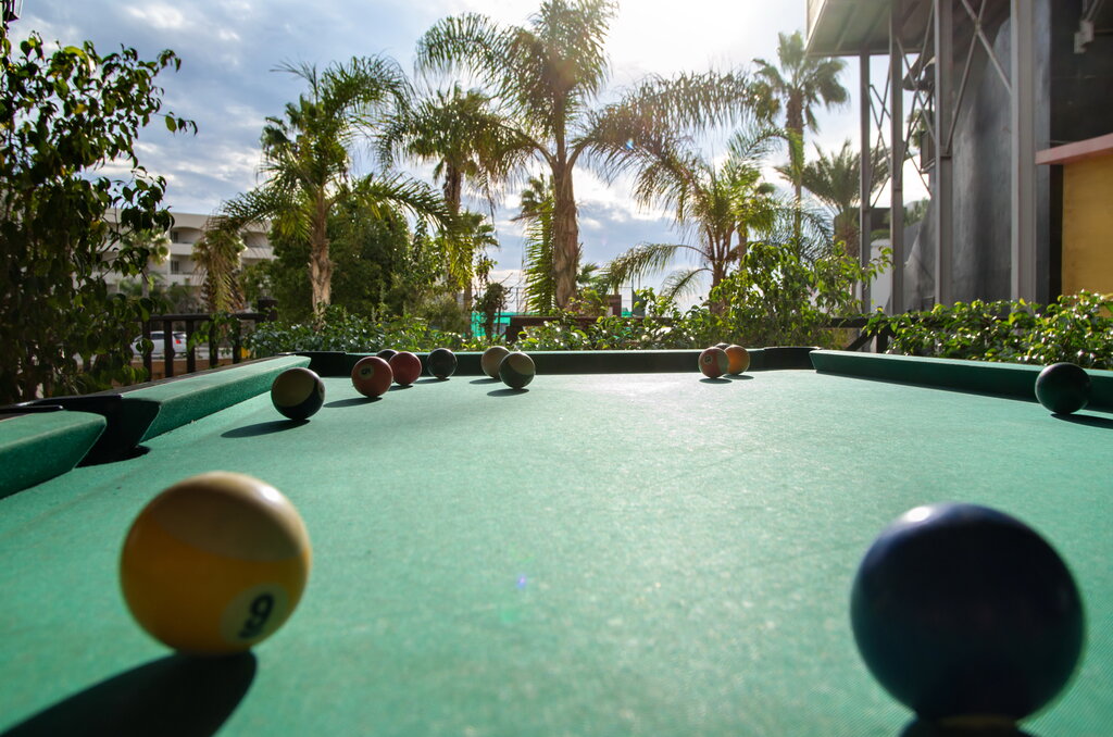 Features institution:menu in English, board games, billiards, bar counter