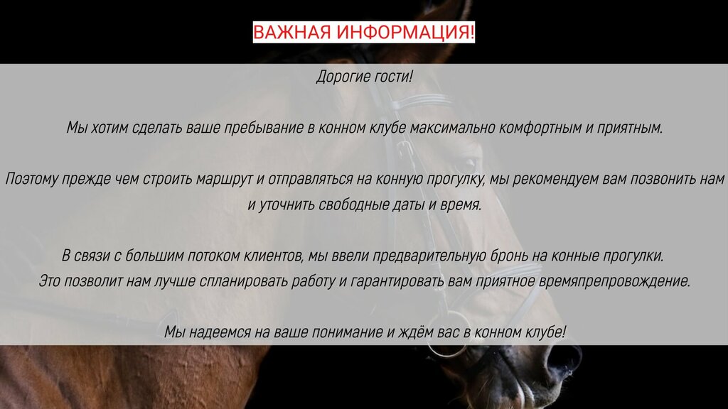 Дорогие гости! Мы хотим сделать ваше пребывание в конном клубе максимально комфортным и приятным. Поэтому прежде чем строить маршрут и отправляться на конную прогулку, мы рекомендуем вам позвонить нам и уточнить свободные даты и время.