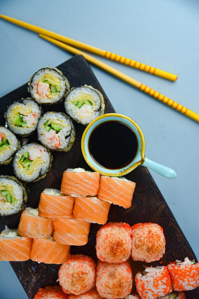 Variety of food:sushi and rolls, pizza, fixed meal