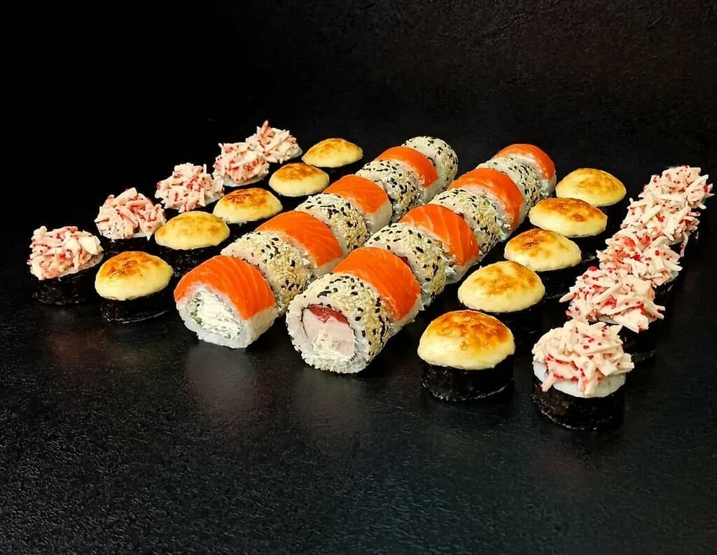Variety of food:sushi and rolls, сhinese food