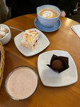Место достаточно уютное, есть различные десерты и выпечка. Небольшой зал, быстрое обслуживание. Цены довольно высокие. Нет кофе декаф, кому вдруг будет интересно) брали латте, какао, рулет и картошку. Какао обычный максимально, картошка… смешно такое назвать картошкой: шоколадный шарик в какао присыпке, очень не похожий на пирожное картошка вкус - прям не понравилось. Хоть и оказываюсь тут второй раз, но все же не могу рекомендовать это кафе.