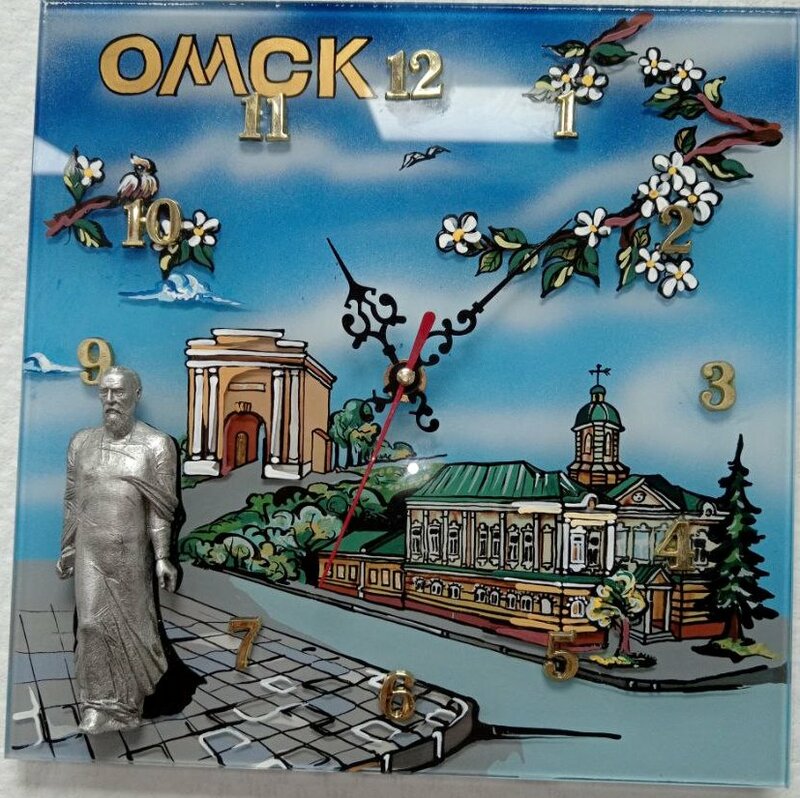 Часы сувенирные "Омск. Любинский проспект". Подарок выполнен методом литья из искусственного камня (полимерная смола с мраморной крошкой). Художественная ручная роспись акриловыми красками. Каждое сувенирное изделие упаковано в красивую прозрачную ко