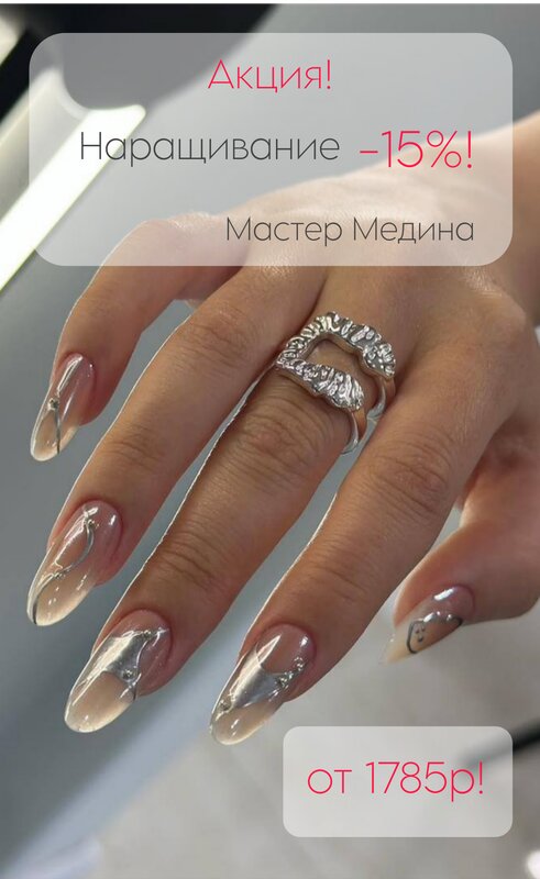 Наш мастер Медина делает проф наращивание разной длины и дизайна. В апреле скидка на наращивание 15%!