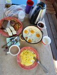 Наше заселение сразу началось странно, что испортило весь отдых. Встречает нас хозяйка с вопросом "вы в большой дом?" Муж ответил, что мы в эконом. И тут понеслось: "да вы что, да куда вы с маленьким ребёнком, да там же никаких удобств, да как вы там жить будете." И финалочка "ну хоть вы ему скажите", сказала она, обращаясь ко мне, чтобы я образумила своего мужа и сняли мы жилье подороже. М-да...такой встречи гостей я точно не ожидала. Появилось настроение развернуться и уехать. Нас пытались воспитать, как маленьких детей и за нас решить где нам жить комфортнее. Получив в ответ "вы хотите конфликт?". Она успокоилась и пошла показывать нам эконом вариант. В принципе, всё совпадало с фото на букинге, через который мы жилье и бронировали. Удобства на улице нас не пугали. Здесь скорее реакция хозяйки больше пугает, что ей самой неловко как у неё там в эконом люди жить будут. Итак, эконом - это второй этаж дома, где живут хозяева с отдельным входом в виде лестницы с улицы. Внутри две кровати, старый телевизор, dvd с дисками, комод, стол с двумя табуретками, чайник. За время проживания очень не хватало хрлодильника. Хоть и жили мы 2 дня всего, но продукты таяли из-за дикой жары днем. Можно по желанию заказать завтрак за отдельную плату 150руб. На фото наш завтрак на двоих за 300р соответственно. Ничего особенного омлет и яичница. На будущее лучше уточнять прожаренные ли желтки делать или нет. Т.к. тут дело вкуса и полностью сырые желтки в нашем случае были не очень кстати. На территории базы есть уличный душ, без обогревателя, просто вода из бочки, туалет, качеля, детский домик, песочница. В букинге пишут, что есть бассейн. Нет. По факту там надувной детский бассейн, который был перевернут и по нашей просьбе его немного наполнили водой. Wi-fi он как бы есть, но с большими перебоями, что можно сказать, что его чаще нет. Как-то так. Заняться на базе особо нечем, сюда только приезжать переночевать. Но при стоимости за отдельный дом или половины дома лучше немного доплатить и заехать на турбазу, где и завтраки входят и бассейн для взрослых нормальный есть.