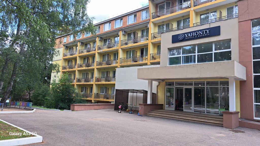 Очень странное впечатление от базы. Старый фонд, много прокуренных номеров, в которых грустно и невозможно находиться. Администраторы стараются найти варианты и переселить. Но из нашей компании 3 семьи из 5 просили о переселении. Предложение отелю сделать номера для курящих и не селить туда некурящих, если не могут их почистить и выветрить. А делается это все из-за полного запрета курения на территории. Курильщиков тоже можно понять. Бассейн-отдельная грусть. Еда разнообразная, но очень быстро заканчивалась, если попросить, то её выносили, но это не было похоже на изобильный шведский стол. Сладости преимущественно из дрожжевого теста. Сотрудники стараются, но на очень морально устаревшем отельном фонде трудно сделать что-то современное. Такое чувство, что лет 15-20 базу не любили и не выкладывали деньги. Такие детские плошадки сейчас не встретишь в московских дворах. Соотношение цена-качество не адекватное, поражаюсь как здесь продаются все номера. База нуждается в реставрации и обновлении номерного фонда. А ещё было отключение горячей воды. Нет резервных систем по водообеспечению. К сожалению, вряд ли выберем это место для повторного посещения,несмотря на фантастические виды на реку и лес.