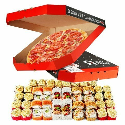 Variety of food:sushi and rolls, pizza