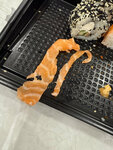 Лосось, соус Спайси, рис для суси, нори, васаби Состав: рис для суси( рис шлифованный не пропаренный, рисовый уксус, спиртовый уксус, сахар, вода, соль), фарш (филе лосося, соус спайс (майонез (масло подсолнечное рафинированное, дезодорированное, вод