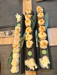 Майами (8шт.) Хьюстон (8шт.) Сакраменто (8шт.) Сякэ терияки (8шт.) 4 порции роллов (32шт.) Состав: Майами: копченый угорь в соусе Спайси, рис для суси, нори, эдам, сыр, кунжут, тобико, соус Терияки, васаби (8 шт.) Хьюстон: лосось в соусе Спайси, сыр