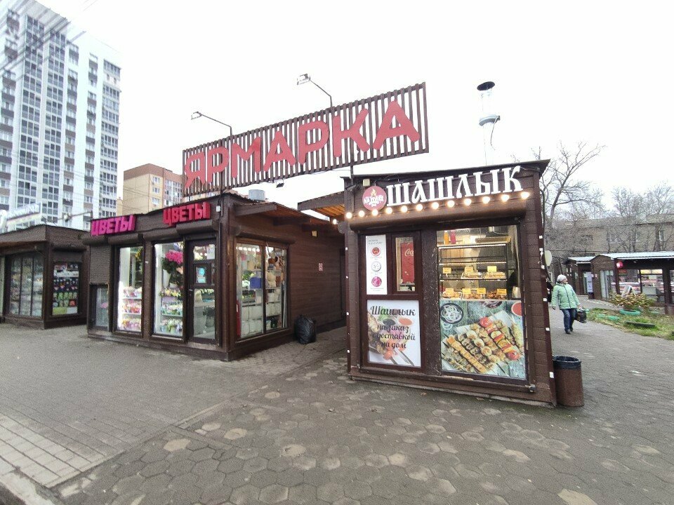 Ярмарка возле дома, очень удобно, в киосках можно найти все что угодно - от сыро-колбасных изделий, до продуктов для животных. Есть отличный мастер по ремонту обуви, вкуснейшие хачапури и огромный выбор цветов. Рекомендую)