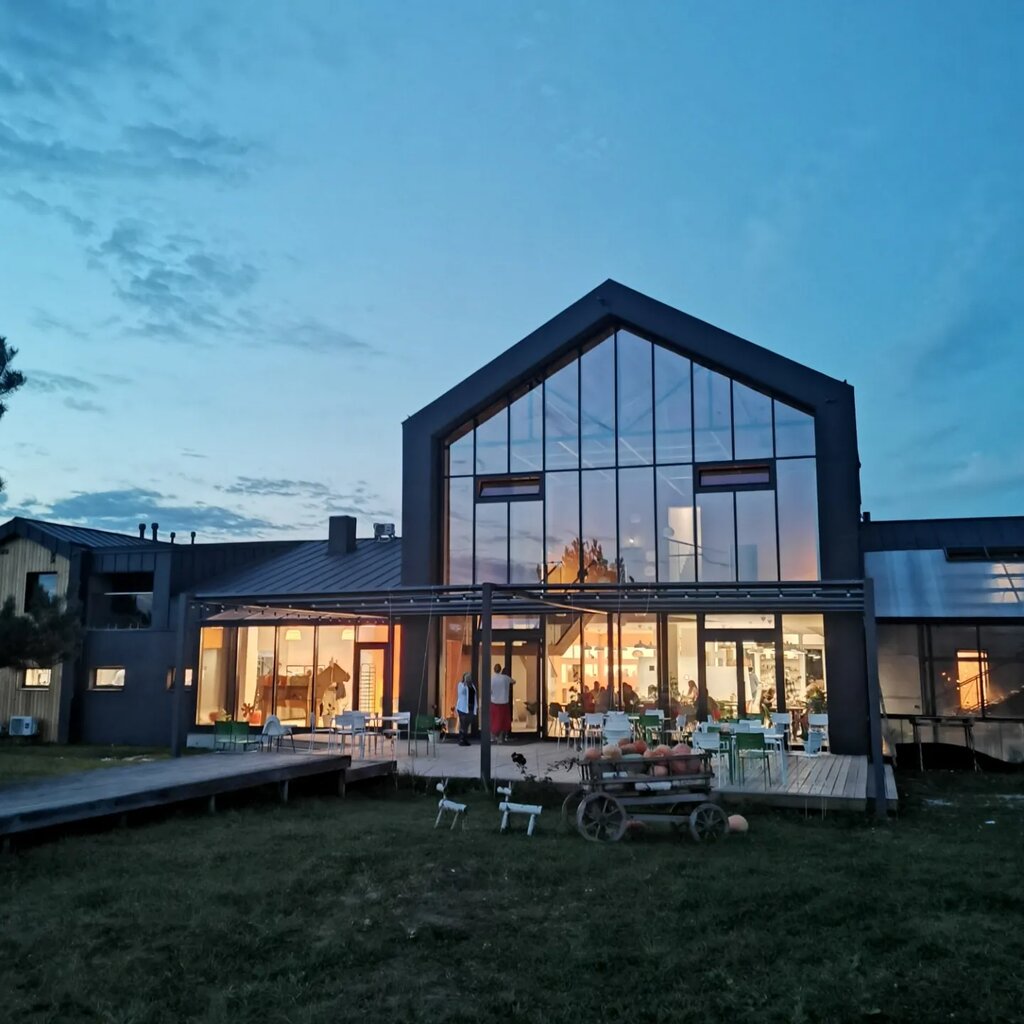 Отдыхали здесь со 2 по 4 ноября. Были впервые. Территория, конечно, огромная, много арт-объектов и локаций, ферма с животными, разные варианты для размещения (отдельные домики или номера в гостиничном здании), проводят мастер-классы, экскурсии на сыроварню. Мы жили в корпусе Теплица в улучшенном номере Стандарт. Двуспальная кровать, диван, шкаф, минихолодильник, чайник, кружки, чай/сахар, балкон с двумя стульями и столиком и видом на пруд. Душ, туалет, полотенца, гель для душа и шампунь. В целом всё необходимое есть, мусор один раз забрали за 2 дня. Номер был на втором этаже, здесь же зона отдыха, диванчики и библиотека. На первом этаже столовая, мы заказывали пельмени, вареники и сырную тарелку местных сыров. Пробовали десерты, подают их красиво, вкусные тортики. Есть кофемашина (платно), несколько кулеров с водой. Столовая начинает работать с 9, один раз утром воды не было в кулерах, ждали, когда придет персонал. Покупали также завтрак, разнообразный, очень вкусная местная молочка (творог, йогурты, запеканка). Ходили в недавно открывшийся гастробар, меню там небольшое. Также местные сыры можно попробовать. В целом место тихое и спокойное, ухоженное. Сняла одну звезду за состояние игровой комнаты. Я была с ребенком. За 3 дня там ни разу не убрались, полы не мыли, мусор не выкидывали. Все-таки там детки играют, чистоту поддерживать надо.