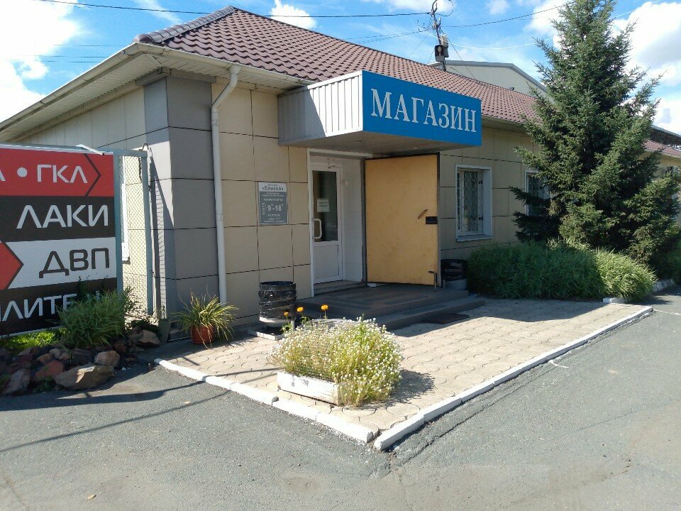 Небольшой магазин строительных материалов, довольно большой ассортимент фанеры и другие стройматериалы.