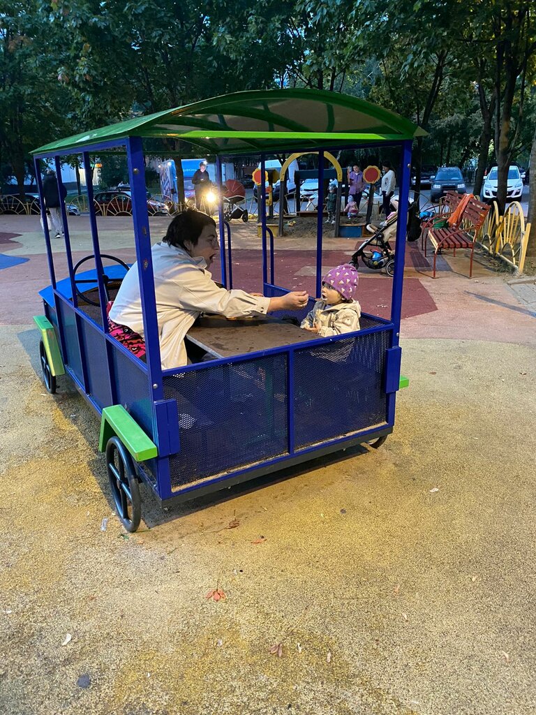 Отличная площадка для младших деток С восторгом наша дочка облащила всю большую конструкцию, потом перешла на малые формы. И как итог прогулки перекус за столиком в машинке.