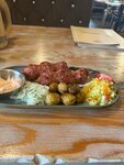куриные крылышки в соусе барбекю, куриные пальчики, сыр сулугуни, чесночные гренки