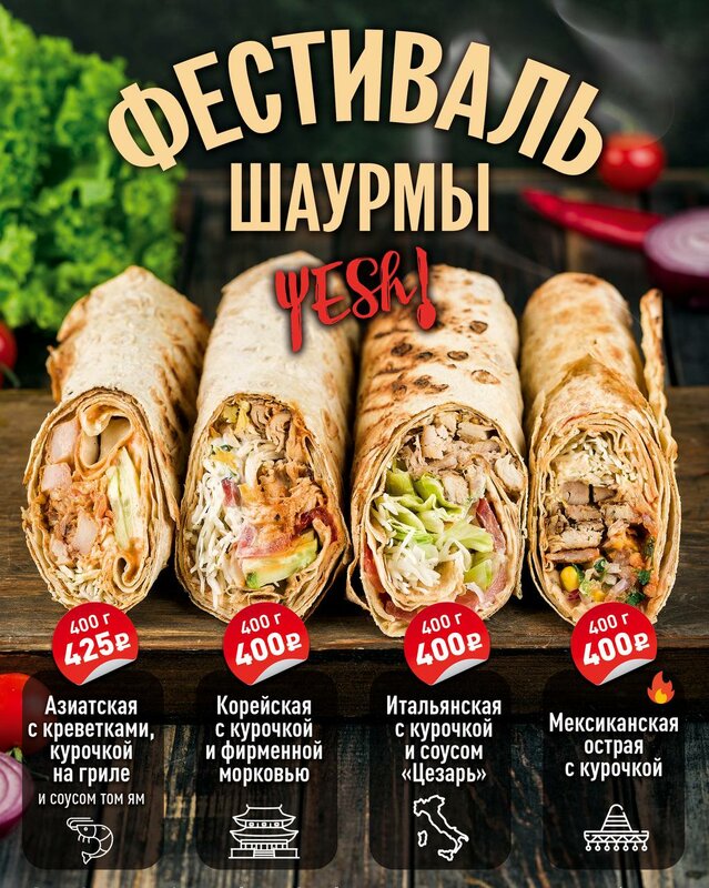 Время для вкуснейшей шаурмы! Сочное мясо на углях, вкусный фирменный соус на выбор, свежие овощи - всё только из-под ножа в хрустящем зажар...