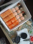 Впервые здесь заказал роллы и суши, решил взять относительную классику: Филадельфию и Калифорнию И я остался доволен, давно не пробовал таких хороших суши Роллы не маленькие, стандартного размера. Рыбу не зажали и нормально положили, рис прям свежачок Дополнительно к первому заказу положили ещё 8 роллов Брал здесь ещё супы: мисо и с лососем. Второй понравился больше, чем-то напомнил уху) Были ещё сладкие роллы Виктория, их залили шоколадным топпингом ну просто кайф Единственное к чему можно придраться - роллы(с угрём) меньше ожидаемого размера. Но давно суши заказывал, может это нормально Надеюсь что ребята будут и дальше делать хорошие суши и радовать меня и других клиентов:)