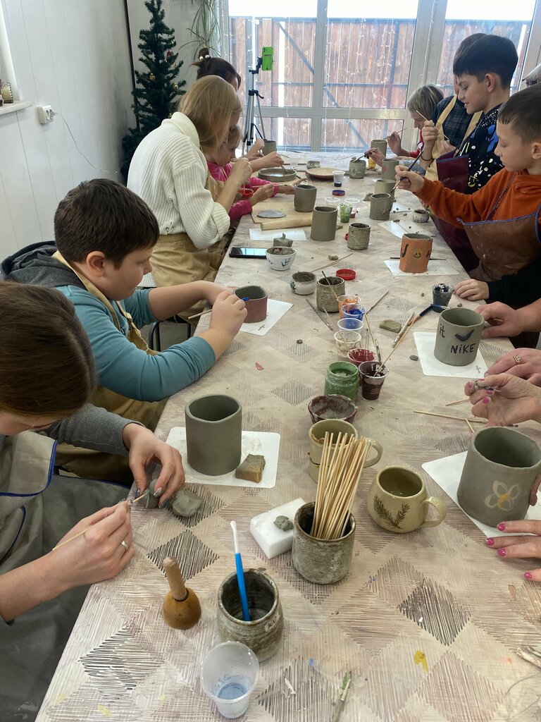 Очень уютная теплая атмосфера царит в мастерской, здесь вы можете посетить мастер-классы по ручной лепке из глины и сотворить под чутким руководством кружку или тарелку, или то, на что натолкнет вас ваша фантазия. Так же есть мастер-классы на гончарном круге, между прочим их 3!!!! А значит можно прийти небольшой компанией, тем более есть возможность посетить мастер-класс компанией из 6 человек на смешанный мастер класс - выполнить чашечку на кругу и слепить блюдце-получиться уникальная чайная пара. Компании от 6 человек записывают на удобный вам день и время, а компании поменьше могут записаться на лепку в групповой мастер-класс., готовые изделия будут вам потом служить они пройдут все этапы обжига и глазуровки и станут вашими маленькими рукотворными шедеврами. А ещё можно купить чудесные готовые изделия, которые будут украшением вашего дома. Рекомендуем, для неоднократного посещения, ведь работа с это ещё и психотерапия, поможет отвлечься от проблем, поможет обрести гармонию. У всех все обязательно получится, главное начать и вы влюбитесь в творчество.