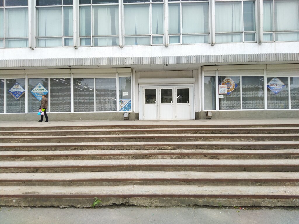 Просторное здание 70-х годов в стиле советского функционализма - интересное, с удобным расположением. Имеет не очень ухоженный вид и плохой асфальт вокруг. В универмаге расположены dns, продуктовый "Пятёрочка" и небольшие арендаторы с разнообразным товаром.