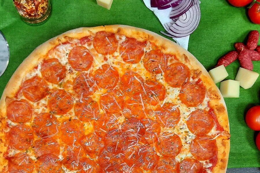 Соус томатный, сыр моцарелла, сыр пармезан, салями, острый перчик халапеньо, орегано
