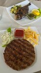Сочная котлета по традиционному сербскому рецепту пожаренная на гриле Состав Говядина, курица, лук, сыр, ветчина, острые специи. Подгарнировка: Картофель фри; огурцы, помидоры, лук , капустный салат.