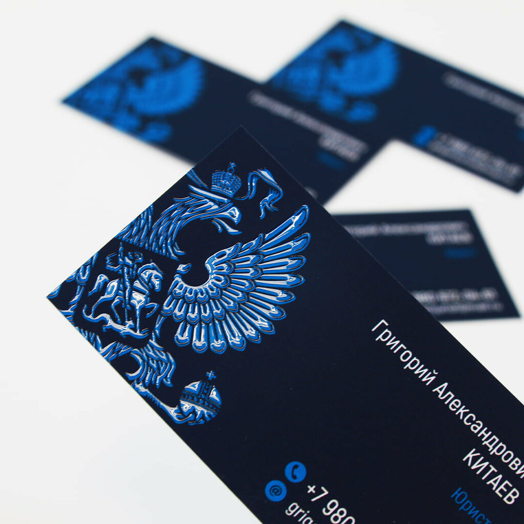 Услуга печати визиток. Печатаем самые разные визитки от классических до премиальных с использованием дизайнерских бумаг и дополнительных методов украшения: тиснение, вырубка, лакировка, выборочный 3D-лак.