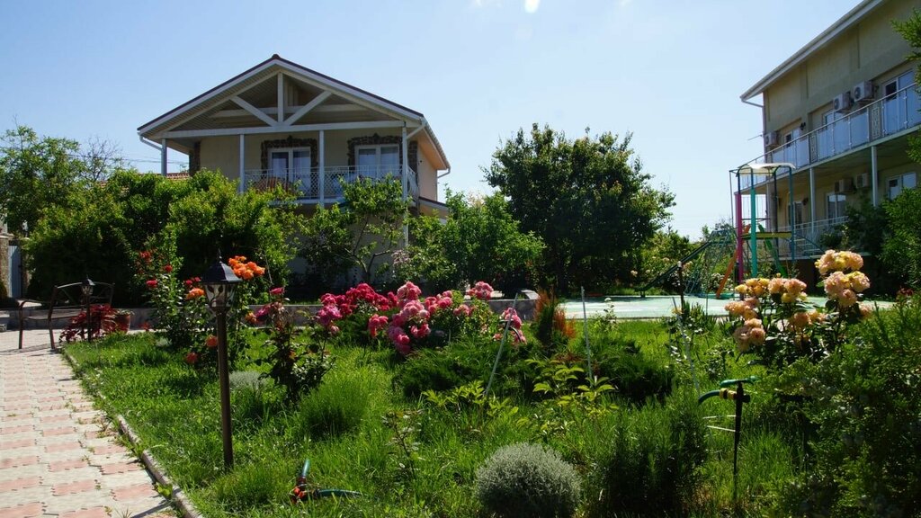 Неплохая гостиница. Приятные чистые номера со всеми удобствами. В номере душ, туалет, холодильник, сплит. Выход на балкон с видом на двор. Современный ремонт. Приятный двор, детская площадка. До моря 800 м. Есть кухня, только готовить на ней нельзя. Можно заказать завтрак, обед и/или ужин. Есть куллер с питьевой водой, чайник, микроволновка для общего пользования. Рядом со столиками монгал. Гладильная доска и утюг на 1 этаже в свободном доступе. Хозяйка очень приветливая, милая женщина. Цены вполне приемлемые. Для отдыха с детьми идеально. От Евпатории 15 мин езды. Единственный незначительный минус - разбитые дороги. И магазин мы нашли один, далековато. Но в общем отличная гостиница. На 5 с минусом