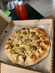 Авторская пицца ручной раскатки на томатном соусе, с миксом сыров, с начинкой из куриного филе, болгарского перца, маслин, с горчичным и барбекю соусами.