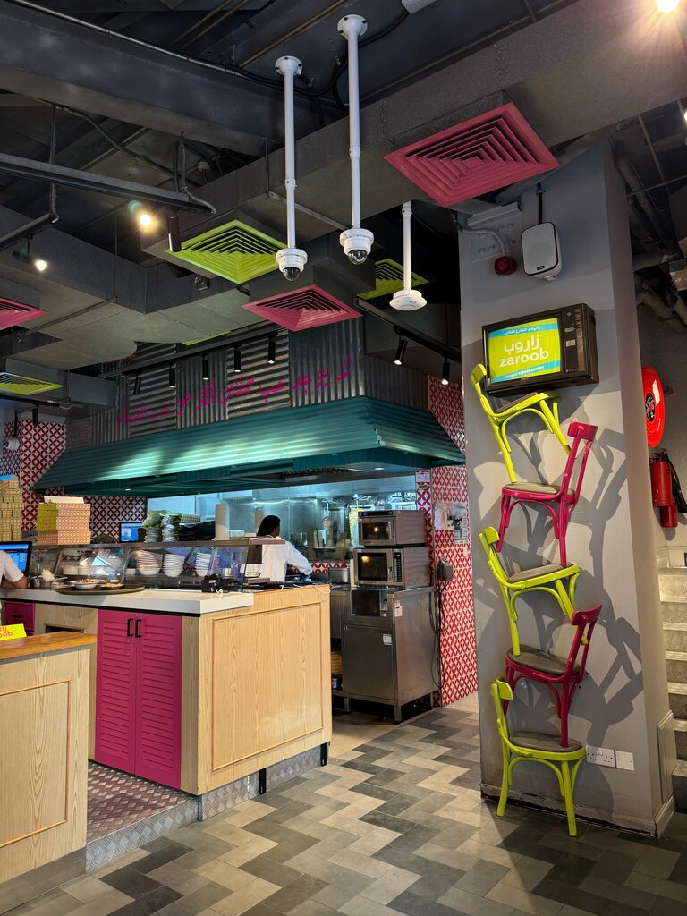 Not knowing the translation of the name, we went to a cafe next to the hotel "by consonance", so that we could later tell friends how we ate in an expensive area of Dubai for only "For RUB" (in fact, the literal translation of Zaroob is a small alley). Authentic Lebanese street eatery (Levant street eatery), as it is. A mix of Arabic, Middle Eastern, Mediterranean and Lebanese cuisines. The portions are far from molecular and haute cuisine – in terms of the generous sizes of the dishes (and the decoration, of course). Moreover, the food here is measured in meters! This is no joke: for 199AED, a real self-made tablecloth with a length of 1 m will unfold in front of you, judging by the table offer. Satisfying, tasty, democratic, budget-friendly, atmospheric, although the design is ambiguous. The hall on the first floor (the second was closed) is painted in garish colors: bright pink, yellow-orange, green, blue. And the furniture is contrasting. There are posters on the walls. The room is not stuffy, but even cold – because of the ubiquitous Dubai condees. They asked me to sit at a table so that it wouldn't blow too hard. There is no menu in printed form, only in the application. Since it opened via a QR code on the table (we couldn't connect to Wi-Fi), we were given a tablet with all the pictures and prices. The order was handled without difficulty, but with laughter. You must admit that "Puck x Zaroob" doesn't sound too serious in Russian. The staff is friendly, attentive, and not intrusive. Since we ordered a cheese pie, falafel, shawarma/shawarma of two types with different sauces, and we also received complimentary tortillas and pitas later, we couldn't handle everything, of course. The pie was kindly packed in a box with us. Fortunately, there was both a refrigerator and a microwave in our hotel room. Payment is possible both by cards and in cash. In general, we were satisfied with the visit to the cafe. And the quality of the cuisine is decent, and not too burdensome on the budget.