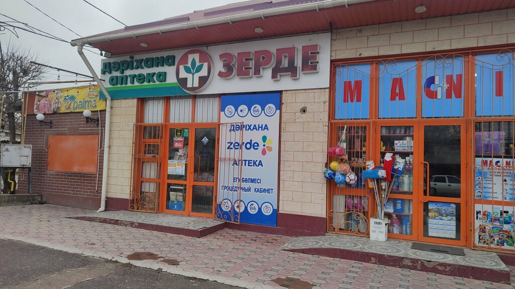 The pharmacy is located on the corners of Sattarkhanov and Bozaryk streets. The location is convenient, there is Parking. Along this row there is a grocery store, a meat store, where there is always fresh halal meat with good service and a household chemicals store. The assortment is good.