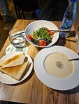 Вот такой у меня был поздний обед или ранний ужин. Какое-то невероятное заведение! Насколько я понимаю, это заведение себя позиционирует, как кафе быстрого питания. Здесь немного посадочных мест, приятный интерьер, но самое главное здесь - кухня, именно она правит балом. Я решил попробовать что-то необычное, так что обо всем по порядку. Салат - это печень с яблоками. Это что за вау!!! Насколько я не люблю печень, но этот салат просто невероятное сочетание вкусов. Просто удивительно сработало чутье и я выбрал это чудо. Дальше был сельдереевый крем-суп. Тоже вау! Очень классно засочетали с сыром с голубой плесенью. Очень вкусно и, надеюсь, полезно. Ну и в качестве основного блюда - паста Сицилия. Это, наверное, единственное от чего я не получил прям восторга, но это точно вкусно. Это чёрная паста с креветками и гребешками. Ярковыраженный морской вкус и соус прикольный с орешками, но не такое уже и вау) Это крутое заведение и причина приехать в Рязань, а самое крутое, что это стоило всего 1,5к