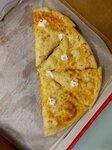 Запечённое куриное филе, шампиньоны, лук, сливочно-грибной соус, моцарелла и петрушка. Кусок пиццы