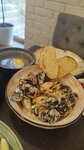 Мидии в створках, в сливочном соусе с гренками.
