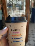 Очаровательное место! Очень приятный персонал - а это главное. Атмосфера уютная, заставляет отвлечься от дел и присесть на пару минут, насладиться кофе) Что ещё хотелось бы отметить - большой выбор напитков, да и цены приемлимые. В круассане хотелось бы чувствовать побольше начинки, а то карамель появилась только на половине (что не умаляет вкуса круассана). Всем рекомендую это место, вкусный кофе и душевный разговор с бариста того стоят🥰 А стаканчики с ручными рисунками от девочек - отдельная история, за которой хочется следить, молодцы!