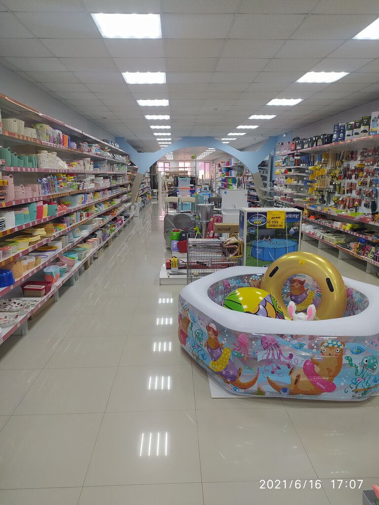 Хороший магазин. Если надо что-нибудь хозяйственное купить-еду туда. Недавно понадобилась куча мелочей-всё там купила: клеёнку, уличный термометр, мерную кружку, ведро, полку для обуви, одноразовую посуду...много всего. Народу много не бывает, ходи спокойно выбирай, что надо. Всегда есть сезонные товары, зимой-к новому году, весной и летом-на огород. На втором этаже посуда, одежда, порошки, косметика.