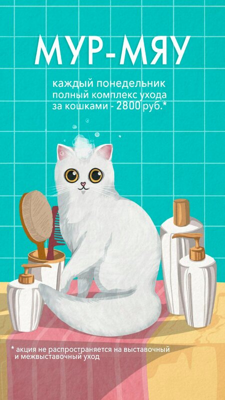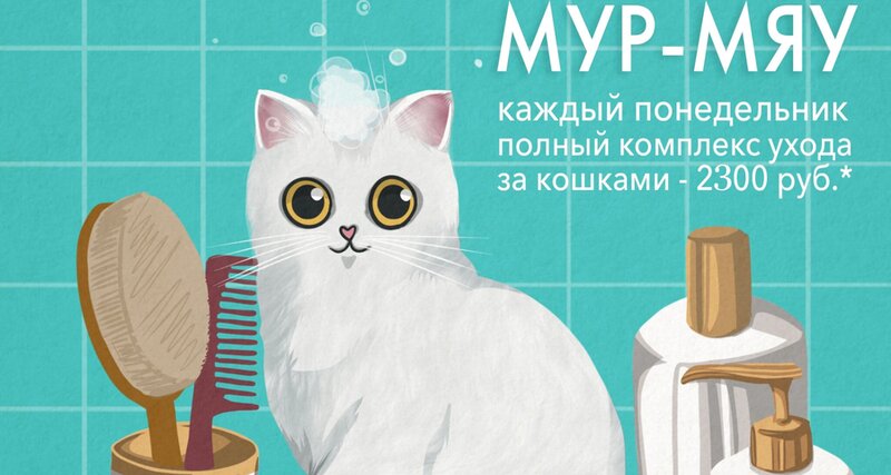 Акция для котиков каждый понедельник, полный комплекс - вычес/стрижка, обезжиривание проблемных зон, мытьё, сушка, стрижка когтей, чистка ушек. *Не распространяется на выставочный груминг и процедуры восстановление шерсти.