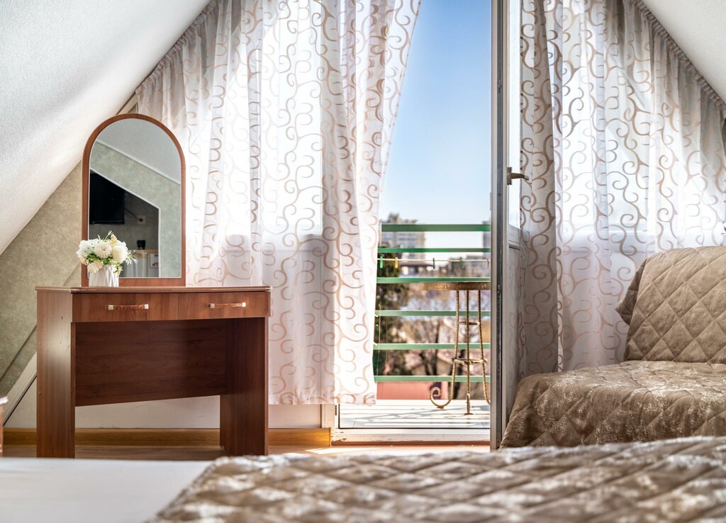 Очень хороший отель по адекватной цене! Понравилось расположение по отношению к морю, инфраструктуре, магазинам. Жирный плюс - наличие своей парковки на территории, учитывая ситуацию с парковками в Адлере, да и в целом в Сочи, это, наверное, одно из главных преимуществ данного отеля, если путешествуете на машине - это идеальный вариант, всегда можно куда-нибудь отъехать, и не бояться, что не будет мест, куда встать. Также хотел бы отметить как плюс - наличие кафе на территории отеля, где вкусно готовят шашлык, курицу, овощи - отдельная благодарность персоналу кафе. Что касается номера, то нам предоставили двухместный номер с балконом на первом этаже. В целом номер неплохой: высокие потолки, отличная шумоизоляция, широкая кровать, где отлично помещается 2 взрослых человека и младенец до года, всё необходимое в номере имеется. Кто-то отмечает номер на первом этаже как плохой, но в нашем случае это было очень удачным вариантом, так как мы были с ребёнком в возрасте полугода: отдельный вход очень упрощает жизнь, поскольку не нужно до номера идти через весь отель, и подниматься на другой этаж с малышом и кучей вещей,учитывая отсутствие лифта. Наличие кафе на территории отеля также несомненный плюс, поскольку нам приносили еду прямо на столик к номеру, за что, опять же, спасибо Александру. Что касается самого балкона, кто-то считает что это не балкон, но лично мне такой балкон понравился больше, просто потому что он показался шире чем этажами выше. Однако есть минусы в номере, которые, я надеюсь, в отеле исправят (за это я не буду снижать звезду, опять же, потому что надеюсь, что исправят, и плюсы перекрывают минусы): дверь в санузел не закрывается (видимо провисает), ручки ненадёжно закреплены, холодильник пережил явно очень много, ну, и если придираться, то не хватает косметического ремонта и москитных сеток на окнах (для нас это было не критично). Каждый день номер убирают, либо в ваше отсутствие, либо уточняют, нужна ли вам уборка - во многих подобных гостиницах этого нет, а здесь с этим строго. В плане тишины неудобств не заметили - как и положено около 11 вечера всю музыку и свет в кафе выключают, если попадаются гости, которые шумят после 11, то лучше об этом сообщить администратору - в общем тут как повезёт. На первом этаже имеется кухня с необходимой утварью, столами, телевизором, кондиционером. Рекомендую ли я отель? Да, но нужно быть готовым к нюансам. На фоне общей продуманности отеля, в моём случае они были незначительны.