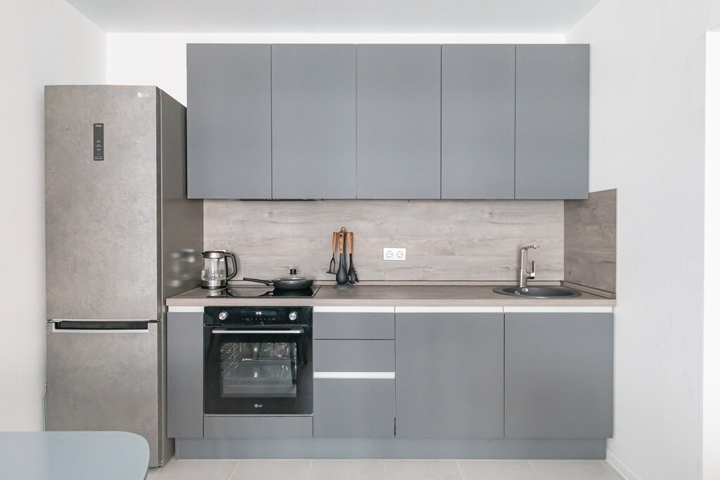Кухня ПА220 ПВХ Вольфрам — стильная П-образная кухня в конфигурации лофт идеально подойдет для студии. Серый фасад из пленки, длина 2 м и 2,2 м, компактная площадью 7 кв.м. Комплектация включает мойку и барную стойку, сочетающуюся с современным ин...