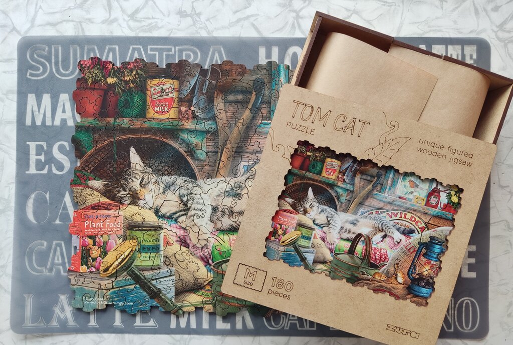 Отличные и очень качественные пазлы, ровные без заноз детали, которые хорошо вставляются. Готовые работы можно крепить на стенку, есть набор для склеивания и крепления к стене. Почти все пазлы скупили и собрали