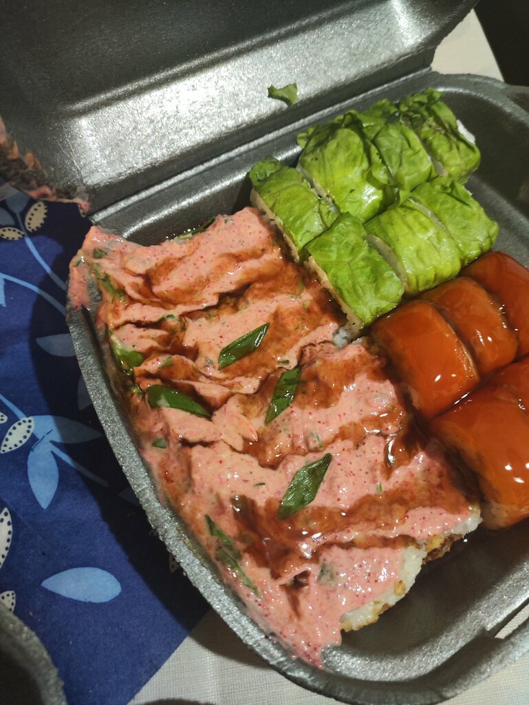 Суши невкусные, разваливаются, начинка однообразная с ненасыщенным вкусом, так же не положили палочки, хотя они были указаны, теперь интересно отравились или нет) не берите здесь.